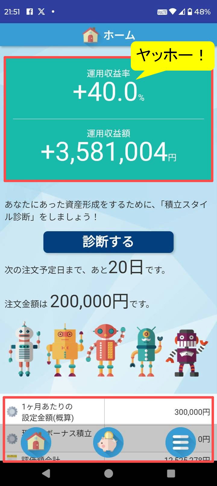 ほったらかし投資で、利益40%達成! 2025-09-12 yokoyama 昨日、日経平均株価が史上最高値を更新しましたね。 その動きと連動して、 利益が初めて40%を超えました。 この儲けで旅行へ行きたいなぁ。 「ほったらかし投資」の LINE公式アカウントのご登録はこちら スマートフォンの方は下記のQRコードをタップ! ↓↓↓↓↓ パソコンでご覧の方は、上記QRコードをスマートフォンで読み込んでください。 投稿ナビゲーション 前の記事あまり知られていない 老後資金の上手な貯め方/下ろし方(ほったらかし投資)次の記事日経平均株価が続伸、お陰様でNISAの利益アップ