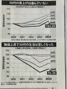 他の年代と比較して50歳代の年収は上がっていないし、物価高で50歳代の生活は苦しくなった。