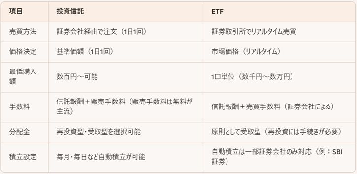 このように、投資信託は「積立・長期運用向き」、ETFは「リアルタイム売買・分配金活用向き」といった性格があります。