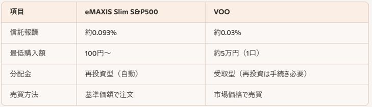 → 長期積立ならeMAXIS Slim、分配金活用やリアルタイム売買ならVOOが適しています。
