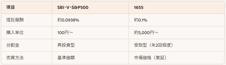 → SBI・Vは積立向き、1655は分配金を受け取りたい人向き。