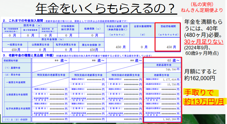 年金の受取額は、(1)現役時代の年収、(2)厚生年金や国民年金を収めた期間、の影響を受けることはご存知だと思います。 先日、投稿した通り、私の場合、65歳から受け取れる年金は、基礎年金+厚生年金の手取り額が約13万円しか