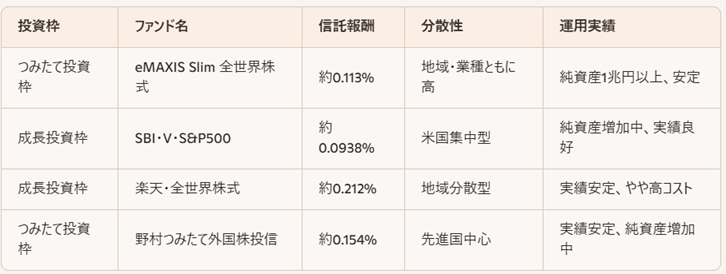 → つみたて枠では「低コスト・広域分散」、成長枠では「テーマ性・収益性」を重視