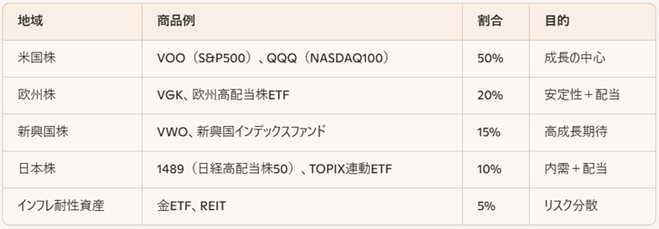 → 米国を中心に据えつつ、欧州・新興国・日本株を組み合わせて「地域分散」を実現。